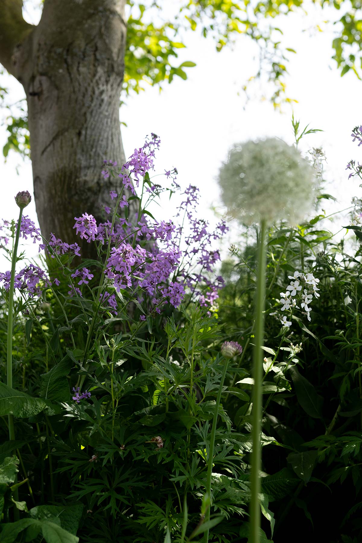 Waarschijnlijk is dit niet de eerste bloembol waar je aan denkt voor een schaduwplek. Toch doen ze het hier, in de (half)schaduw onder onze walnotenboom, al jaren verrassend goed. Het voordeel van deze plek is dat de walnoot pas laat in het voorjaar blad krijgt, waardoor er in de eerste maanden nog behoorlijk wat licht door de takken valt. De witte, bolvormige bloemen op hoge stelen zorgen voor een speelse hoogte in de border. In combinatie met varens, Lunaria annua (judaspenning) Digitalis (vingerhoedskruid) en Geum ‘Mai Tai’ (Nagelkruid) geeft dit een mooi effect. De warme perzikroze kleur van de Geum is daarbij echt mijn favoriet. Een andere goede combinatie is Allium ‘Mount Everest’ (sierui) met Persicaria. Deze bloeit nog niet in het voorjaar en daarom voegt de Allium in deze combinatie echt iets extra’s toe aan de border.