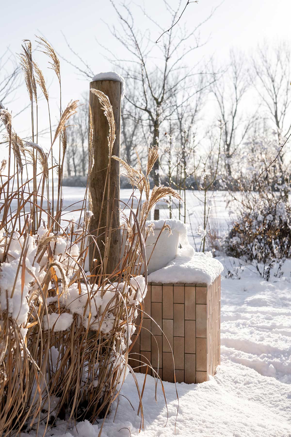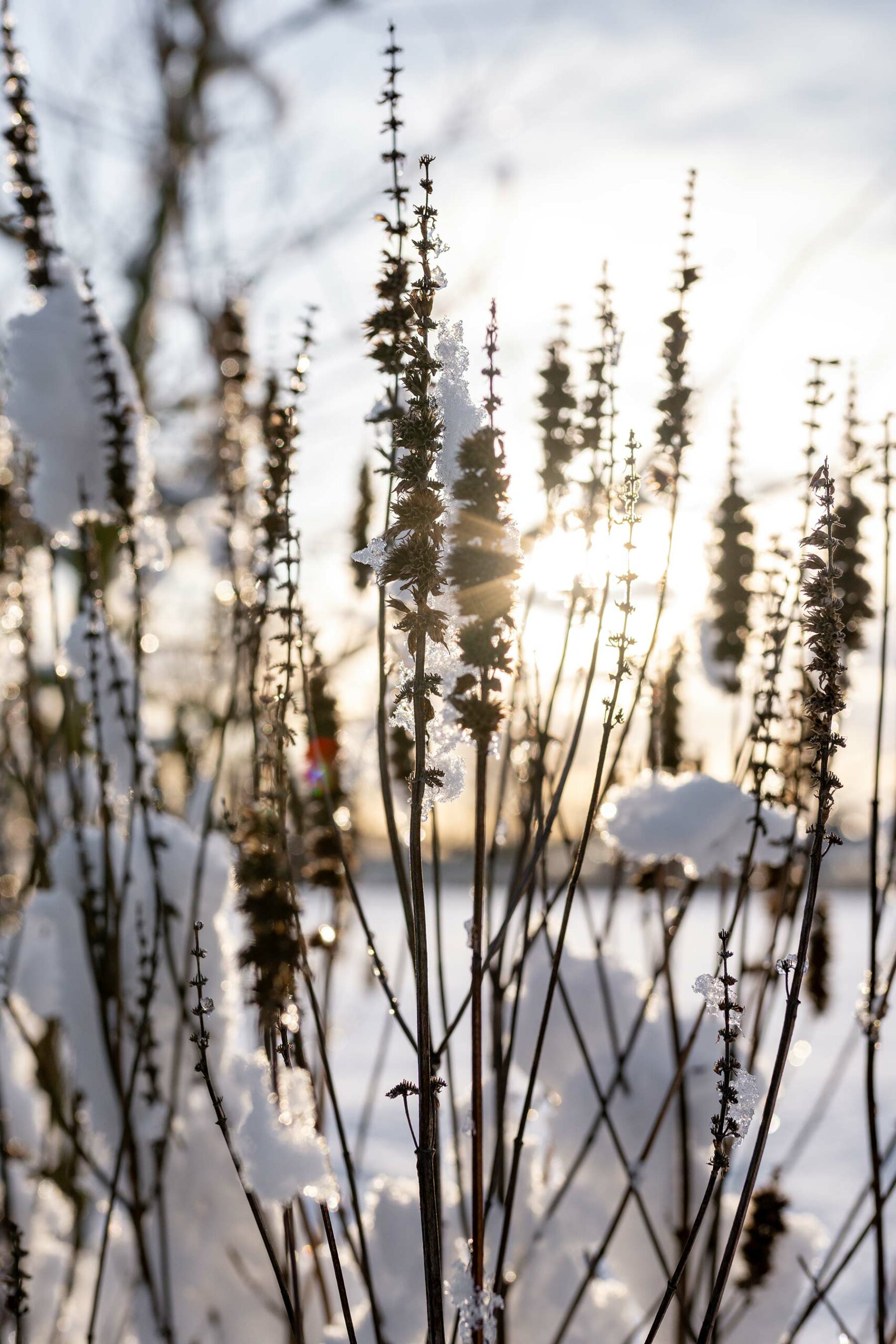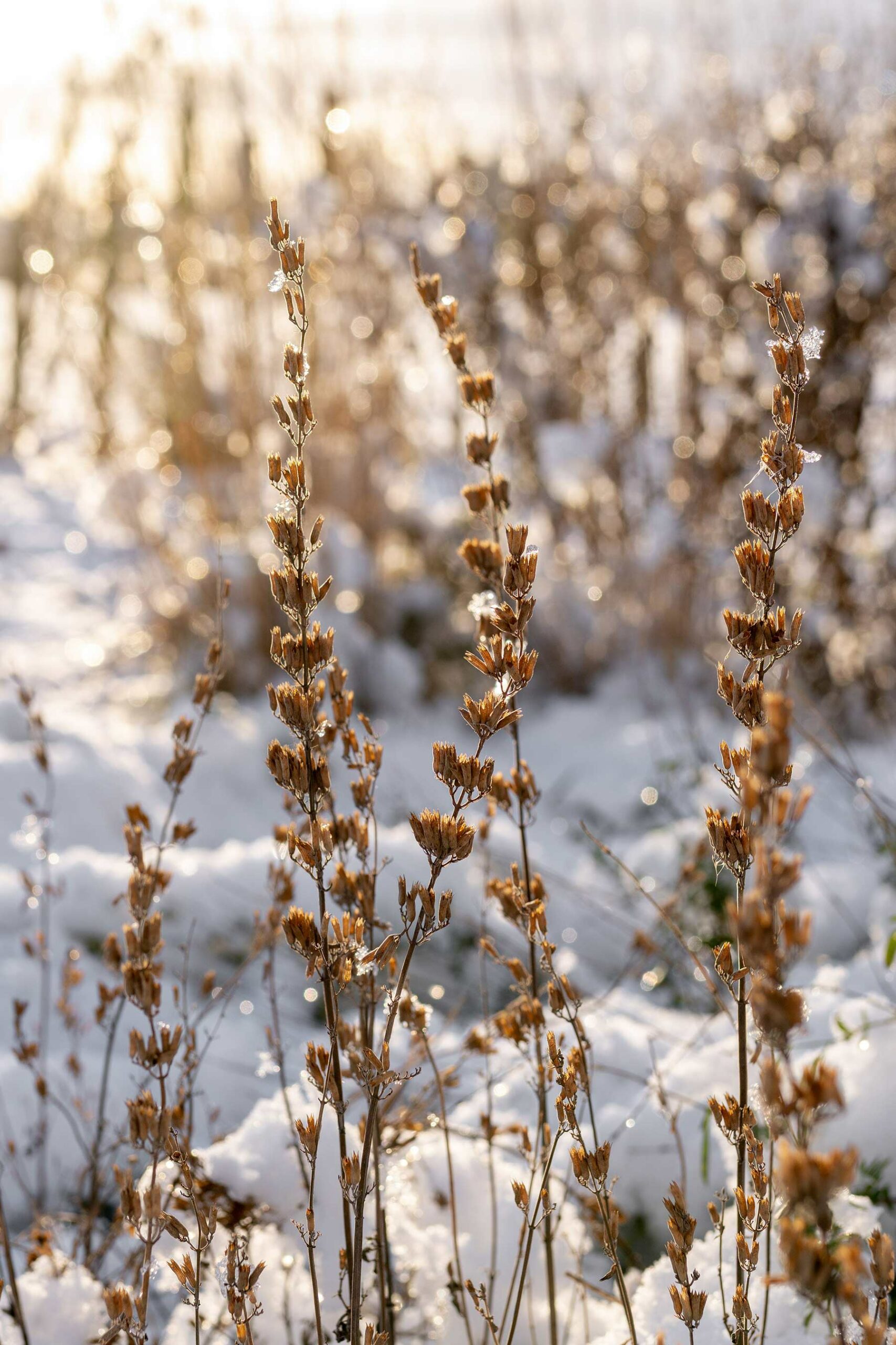 Agastache ‘Blue Fortune’ is zo’n plant die in de zomer met zijn paarse bloei volop kleur en leven brengt. Een groot voordeel is dat hij er in de winter ook nog steeds mooi uitziet. Wanneer de bloemen uitgebloeid zijn en de plant rust, blijven de rechtopstaande aren en stengels overeind staan. In de koude maanden vormen ze een subtiel silhouet in de border, vooral met rijp, sneeuw of ijs erop is dit een extra mooi gezicht. Helaas is de plant niet heel winterhard en kan hij daarom wel eens sneuvelen in de winter. De mijne staat hier inmiddels al vier jaar en tot nu toe gaat het goed. In de winter blijft de plant belangrijk voor insecten. De holle en soms licht verhoute stengels bieden schuilplaatsen voor kleine insecten die overwinteren, zoals wilde bijen en lieveheersbeestjes. Ook spinnen gebruiken de uitgebloeide aren graag als beschutte plek.