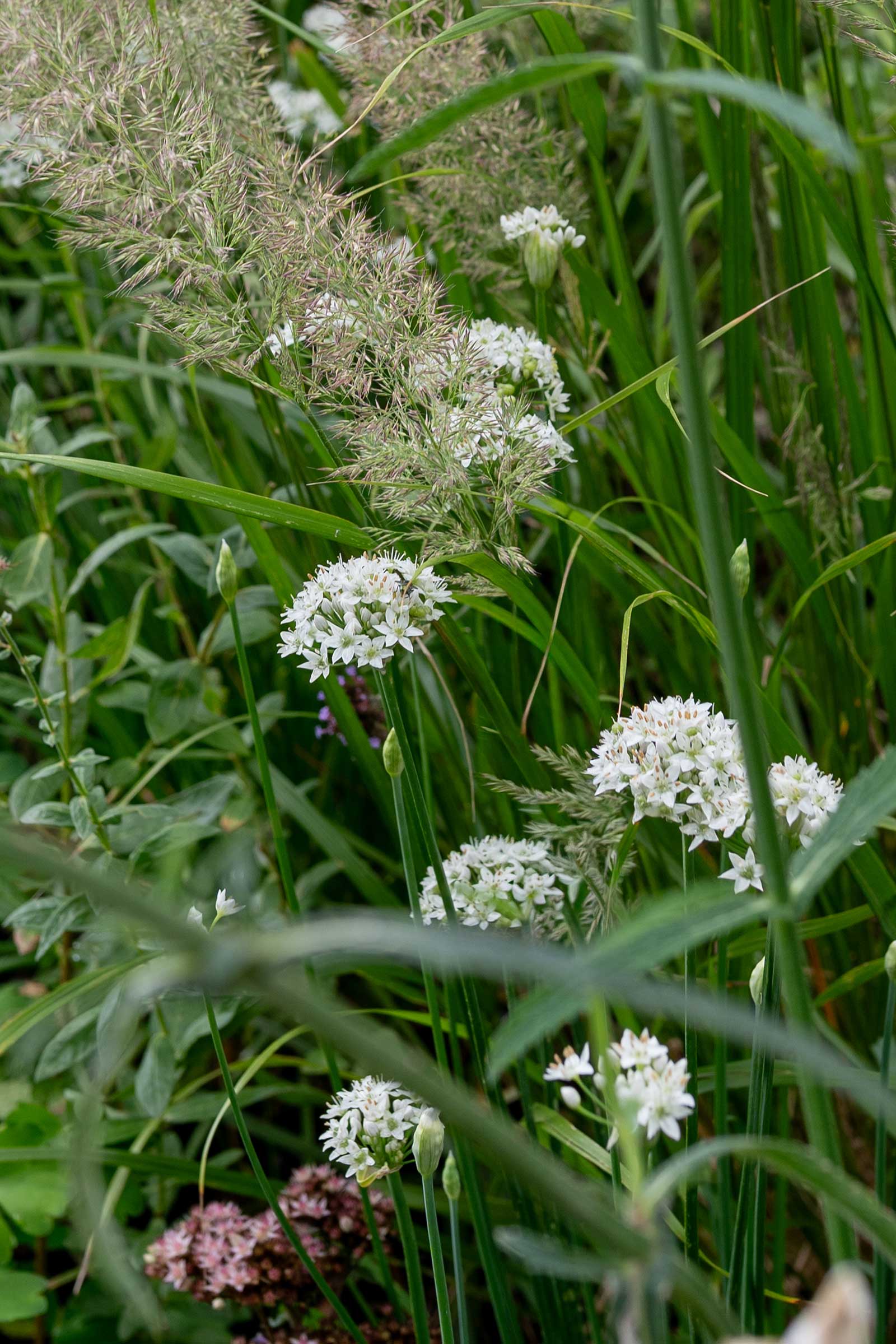 Allium tuberosum, ook wel knoflookbieslook genoemd, is in de zomer een bescheiden maar waardevolle plant met frisgroen blad en luchtige, witte bloemschermen. Hij bloeit laat in het seizoen, vaak pas in augustus of september, en is dan een belangrijke nectarbron voor bijen en zweefvliegen. Na de bloei blijven de zaadhoofden mooi staan en kun je de kleine, zwarte zaden goed zien zitten in de opengebarsten bolletjes. In de winter veranderen ze in een mooi silhouet. Ze geven structuur aan de border en passen prachtig bij siergrassen en andere vaste planten.